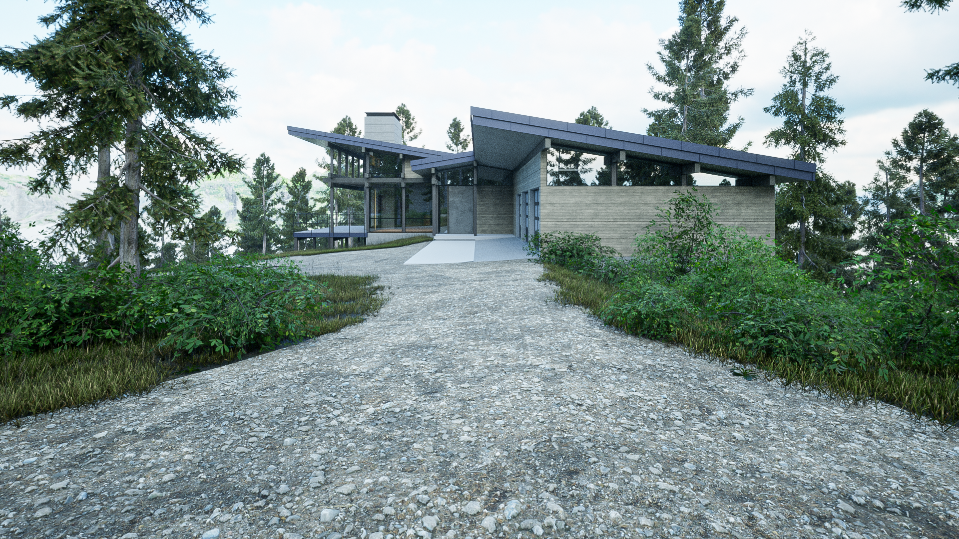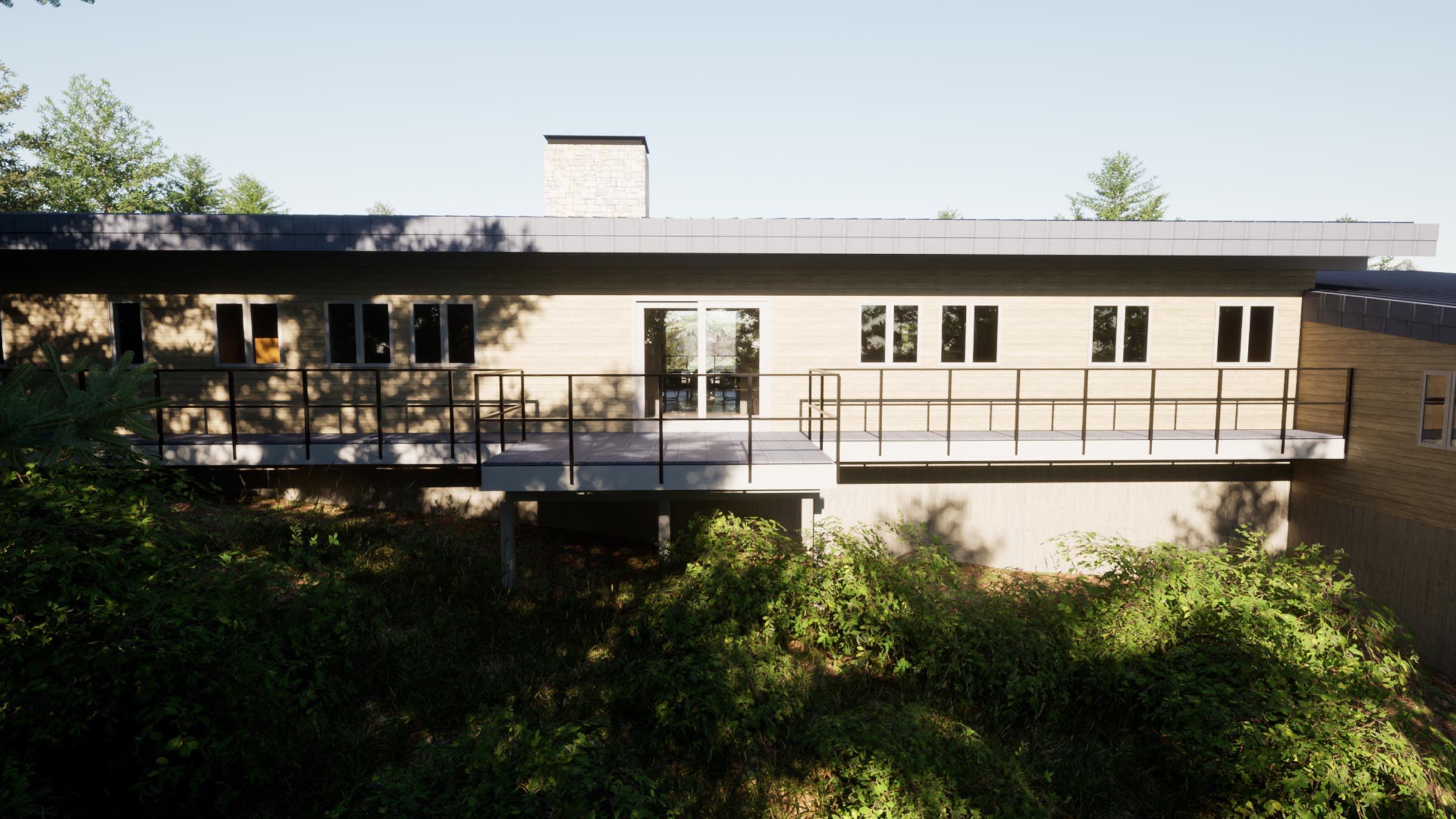 valley below can be seen veiled through the trees. The home's natural material selection helps it to blend into